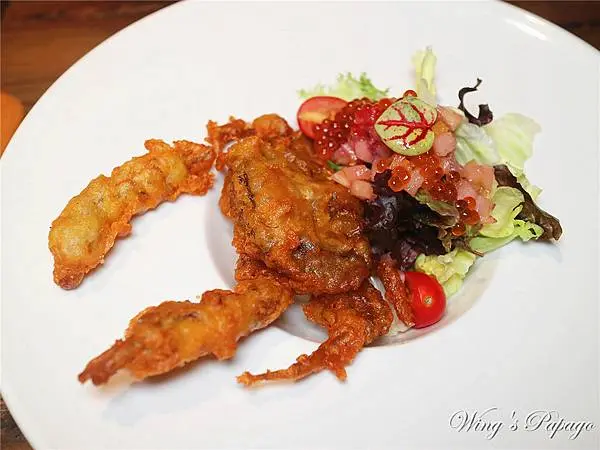香酥海味軟殼蟹搭配季節水果莎莎醬,佐生菜、小蕃茄及鮭魚卵提味,