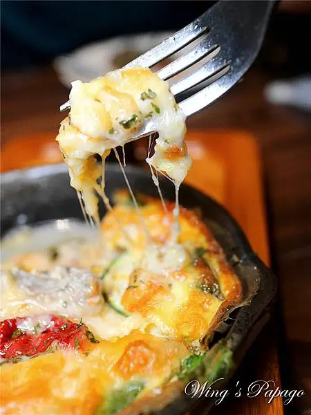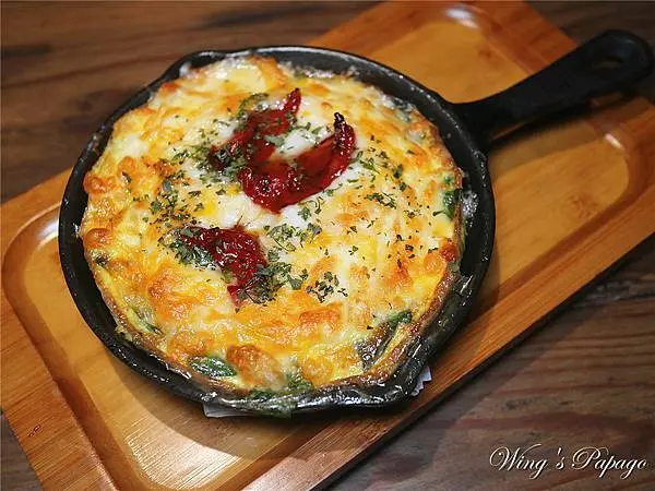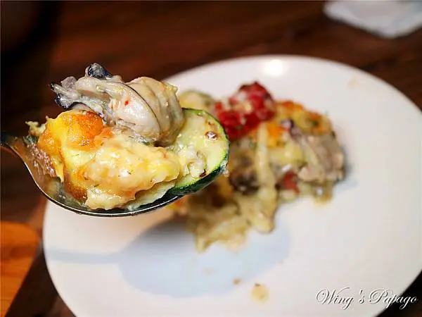 烘蛋內饀有來自台灣東石漁港的鮮蚵、綠櫛瓜、番茄丁、九層塔、上層使用雙色起司焗烤,