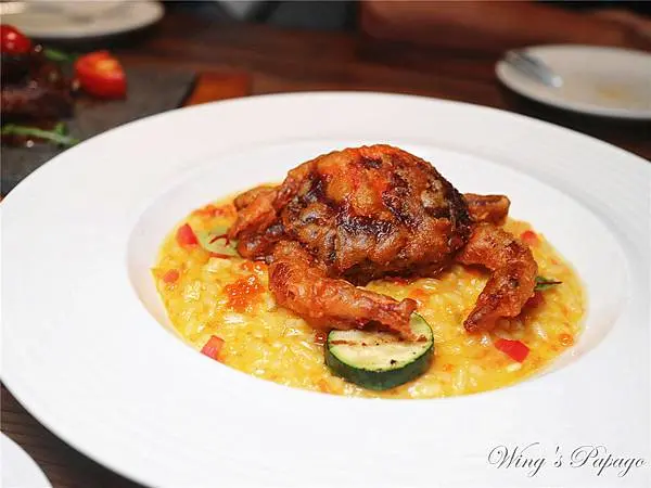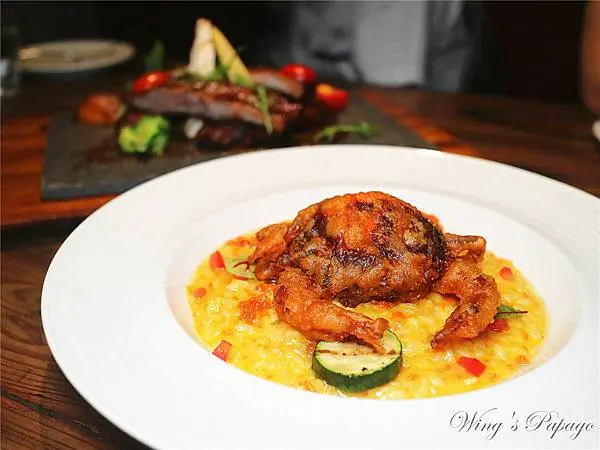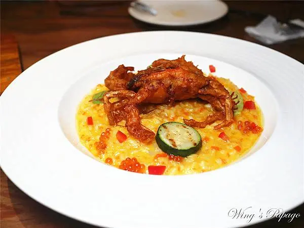 整隻酥炸軟殼蟹放在蟹黃奶油燉飯上,看起來擺盤好美好誘人啊!