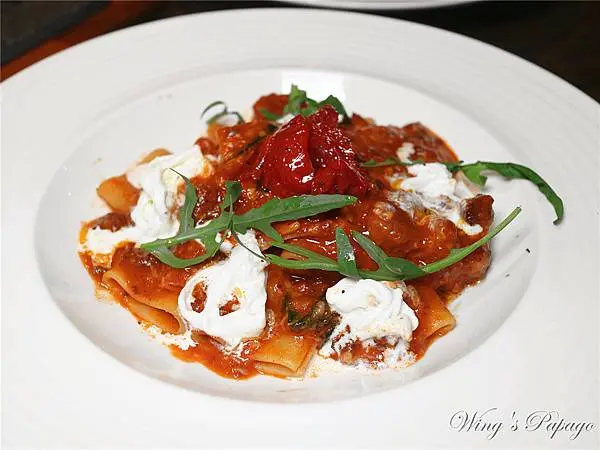 搭配義大利肉醬、濃厚番茄、新鮮起司、牛筋及芝麻葉,吃得到牛筋的軟Q,