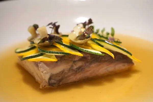 蒸好的金目鱸魚 用烤過的黃綠櫛瓜像魚鱗班的鋪疊