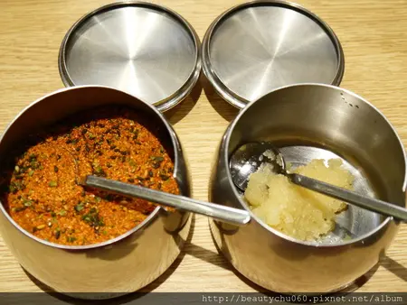 店內提供的五味粉及蒜泥 依個人口味加入拉麵中提味