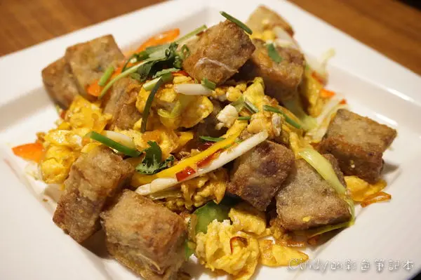 蘿蔔糕切塊以後油炸 外層帶一點微脆的口感 裡面是軟軟熱熱的