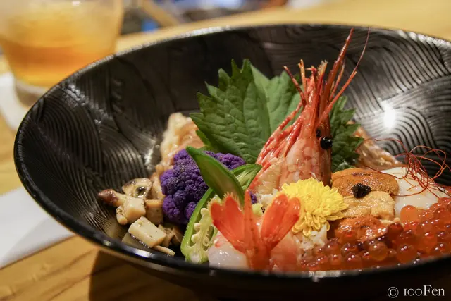 顏色豔麗的丼飯一上桌,瞬間成為目光焦點,高雅的黑色碗盤更是襯托著各式高級食材的色彩,此次前來就是為了這一碗!