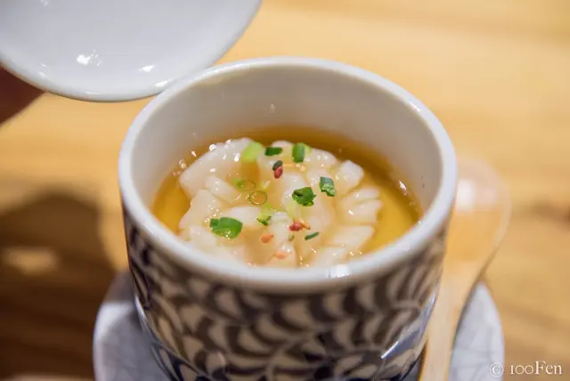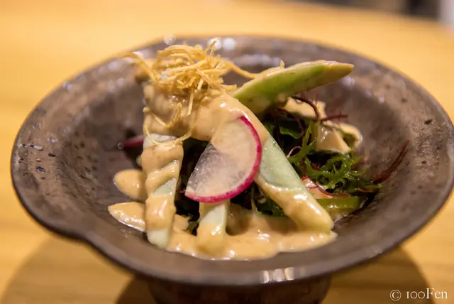 冷前菜以石蓮/櫻桃蘿蔔/炸牛蒡絲組合而成,淋上主廚調製的日式胡麻醬,香濃美味。石蓮清脆而飽含水份的口感意外地令人印象深刻,是一道特別的小點