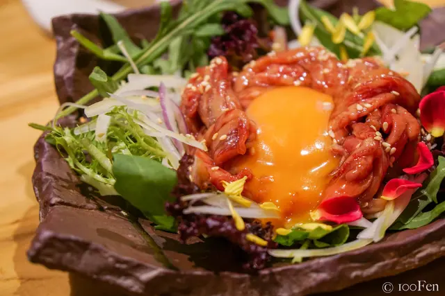 橘黃色的生蛋黃圓潤飽滿,吃的時候稍稍拌開讓它流瀉而下,均勻的沾於油花細緻的生和牛上,畫面多麼療癒