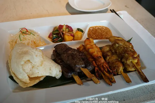 我點的是"南洋沙嗲" ,左邊是蝦餅,然後是牛肉、草蝦與雞肉的沙嗲,每一種都三串。