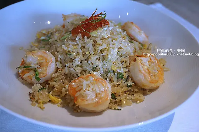 朋友點的蝦仁炒飯,五顆飽滿新鮮的蝦球,以及油亮且粒粒分明的炒飯,頂端還有鮭魚卵,用看的就很好吃!