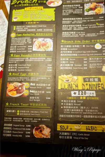 餐廳提供的餐點種類有早午餐、義大利麵、燉飯、三明治、漢堡、烙餅、炸物、飲料等,