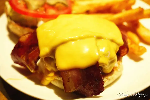 還舖上雙層的起司和兩大條煙燻培根、酸黃瓜、生菜及蕃茄片搭配,組合起來整個看來很豐盛!