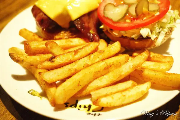 牛肉堡配菜可選薯條/薯泥/玉米/水果四選一,我們選了跟堡類是好朋友的薯條,