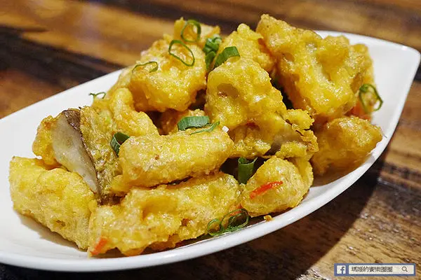 「金沙杏鮑菇」酥炸成金黃色讓人食指大動,有別於一般將鹹蛋黃以拌炒的方式,把杏鮑菇炒得入味的作法,第一次吃到外層有鹹香酥脆的鹹蛋黃,咬下去裡面卻又是多汁的杏鮑菇