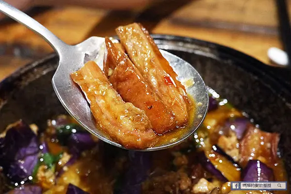 「塔香肥腸煲」不禁要和五更腸旺做個比較,同樣以鐵鍋煲熱,加入茄子、肉末和肥腸,並以九層塔提香入味,煨出一道超級下飯的菜餚