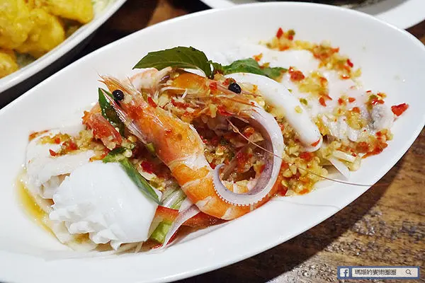 「泰式海中寶」裡面有魚片、軟絲和鮮蝦,加入大量的辣椒和蒜末,有著泰式傳統的酸辣風味,辣度中辣,也是好分泌口水的一道菜