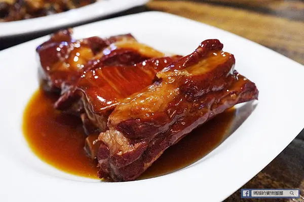 肥瘦均勻的豬助排,加入獨門製汁細細煨煮入味,醬汁的比例調配和烹調時間的掌握是讓這道菜好不好吃的關鍵