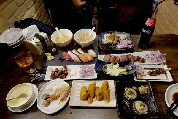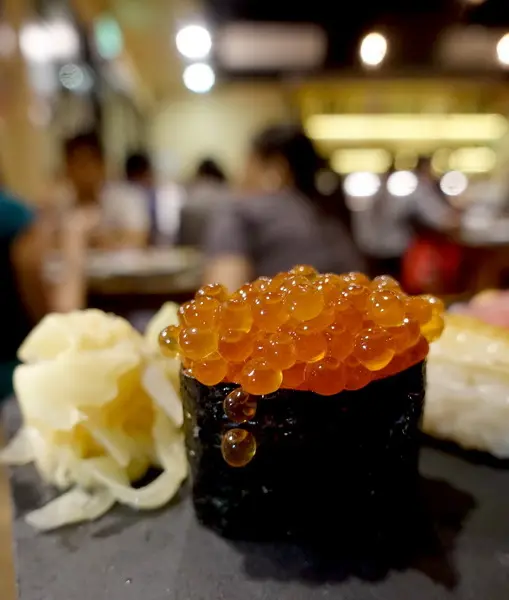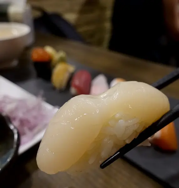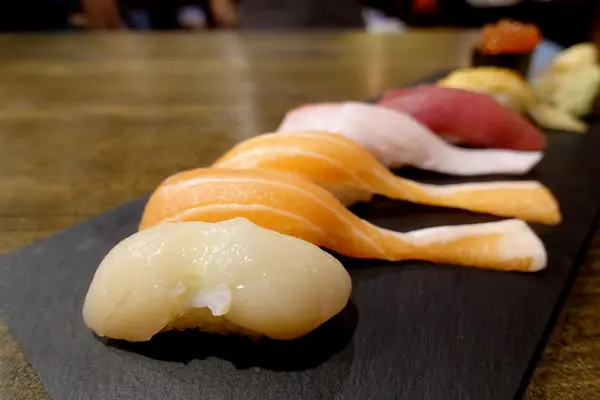 干貝、鮭魚、鮪魚、炙燒比目魚鰭邊、寒鰤魚肚、鮭魚卵