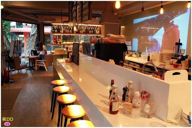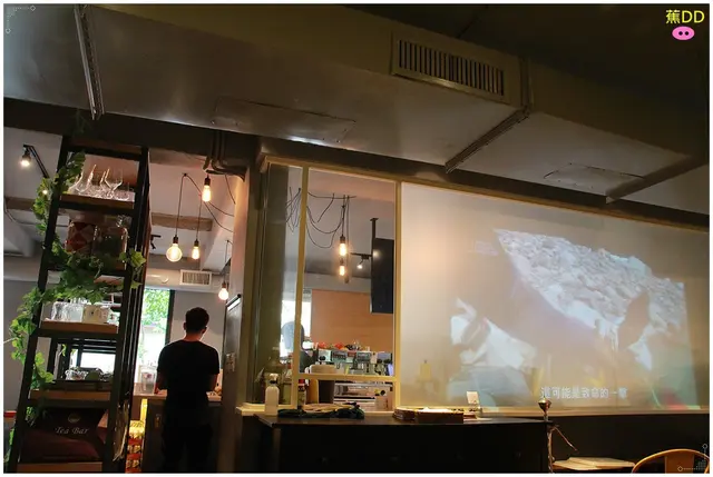 『派森烘焙廚房』』坐落在綠意盎然的民生社區巷弄內,一眼就讓人看見的藍色遮雨棚,大片的玻璃窗及木質自動門,低調卻又讓人亮眼的設計,路過的消費者很難不注意到,一進入店內映入眼簾的是吧檯區,吧檯區後方有很大片的投影布幕,這次我們就被安排在面對投影布幕區,可以讓阿噗邊吃飯邊看大電視(噗爸噗媽心想:嘿嘿…這餐我們應該可以好好享用美食了!!) 。