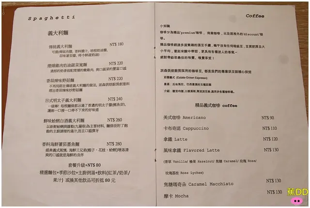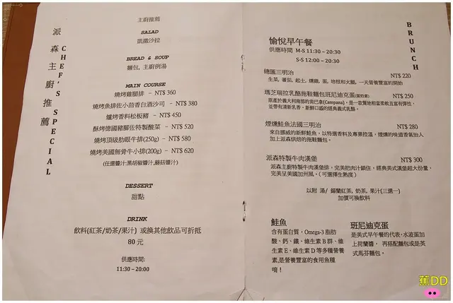 MENU種類大致分成燉飯、主廚推薦排餐、早午餐、義大利麵、飲品等,每一類的餐點選擇性其實不多(都約五六種吧~),所以這次噗爸就選了早午餐裡的『派森特製牛肉漢堡』 (噗爸的胃都不知道裝了幾頭牛了!!!),而噗媽照樣為了愛子選了『日式明太子義大利麵』,由於早午餐已經有湯和飲料了,所以這次只有噗媽升級套餐+$80元。