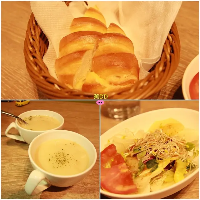 套餐的麵包好像是『蜂蜜奶油麵包』,看起來好像很不可口,咬了一口後噗媽馬上跟它道歉,也太好吃了吧~~根本不是外表看的那樣平淡,可惜架上沒了,不然噗媽一定買兩條回家嗑!!至於和風沙拉跟例湯就表現中規中矩,風采都被麵包奪走了!飲料部分噗媽加價$40換購最愛喝的『熱拿鐵咖啡』,拉花是一隻可愛的熊熊,咖啡跟牛奶比例恰到好處,又夠熱(噗媽最怕喝拿鐵的溫度要熱不熱的),好好喝!