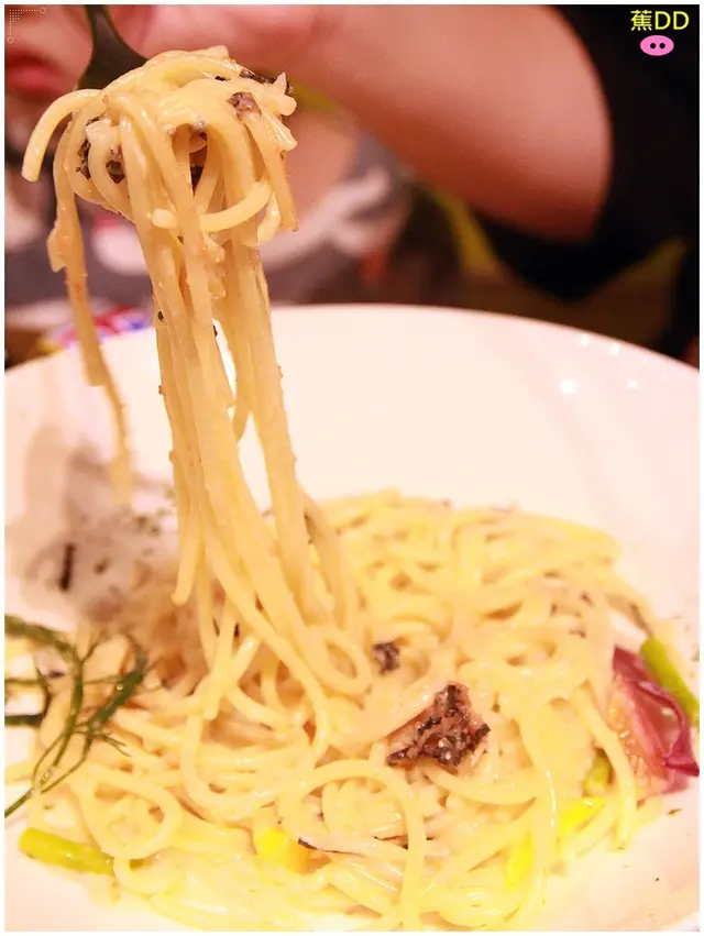 當服務員把噗媽點的義大利麵送來時,我們都以為餐點送錯了,可能是之前吃過的明太子義大利麵的明太子都多到讓麵條呈現橘紅色,而這次呈現的是一般的奶油色,且也看不到什麼明太子(原來是被海苔遮住了),但其實明太子的量真的不多,可能是吃過『阿喜』及『GOGO PASTA』所以胃口養壞了,這道明太子義大利麵不難吃,但跟心理預期有段差距。