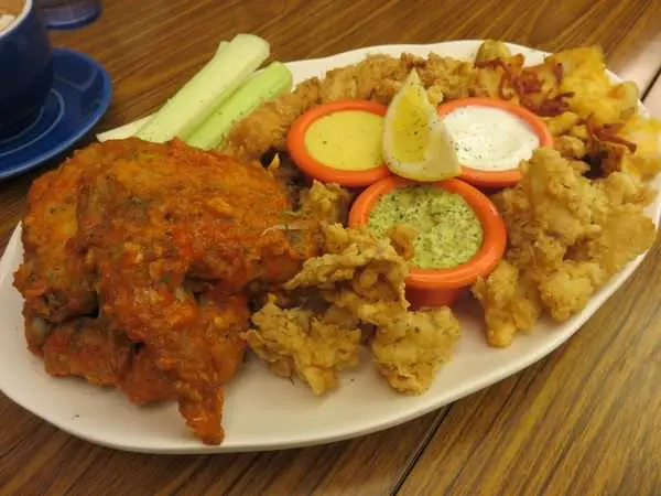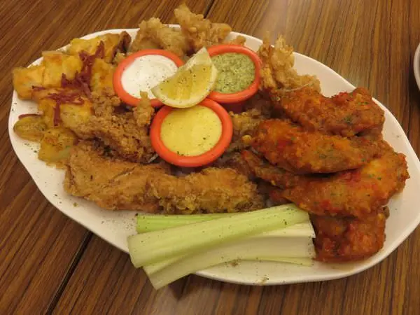 芹菜、雞柳、魚、辣雞翅加上三種醬
