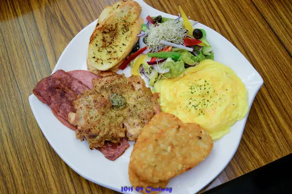 有香料雞腿排,生菜沙拉,兩塊烤麵包,兩份薯餅,兩份培根和火腿,歐姆蛋