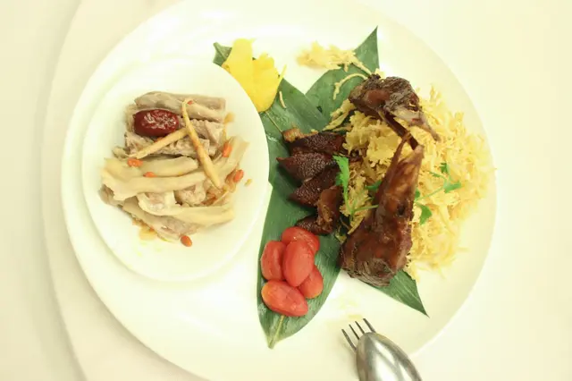 好的,不得不說開胃菜燃起我熊熊吃慾時,來了一大盤看起來像是鹽水雞和東山鴨頭的料理澆熄了不少