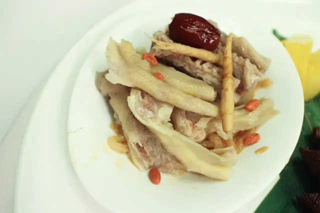 前菜是「滷炸風味鴨首拼」,涵蓋滷炸及藥膳二種風味。滷炸鴨頭及鴨頸以特製滷汁滷過後再炸「藥膳漬掌翅」則將鴨掌、鴨翅加入紹興酒、生蔬、紅棗、枸杞、配上白滷水,整體適合很會啃骨頭的民眾,但對於我牙套在口,不是那麼好方便咀嚼,沒關係~我們今天有12道菜,留著胃口給其他道