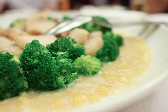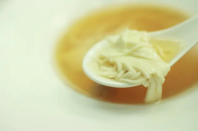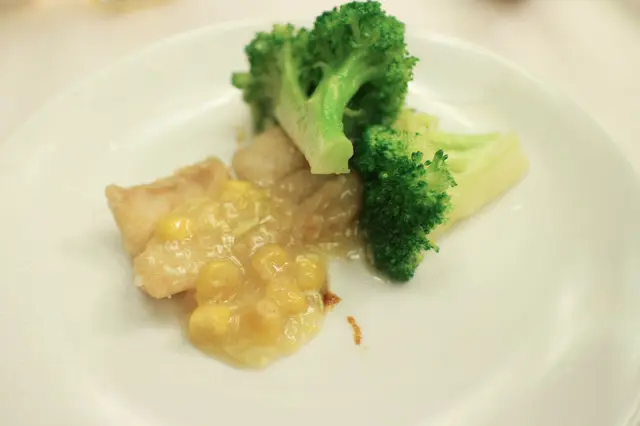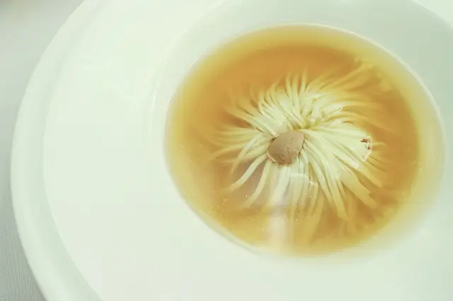 中間散開如菊花花瓣是蛋豆腐,坊間常用的其實是金針菇,九華樓使用蛋豆腐考驗刀工,口感軟嫩吸飽滿滿雞湯,中間一抹鵝肝,雞湯喝起來就像滴雞精濃郁,嘴唇抹上一圈膠原蛋白般,算是今天令我相當驚艷的一道