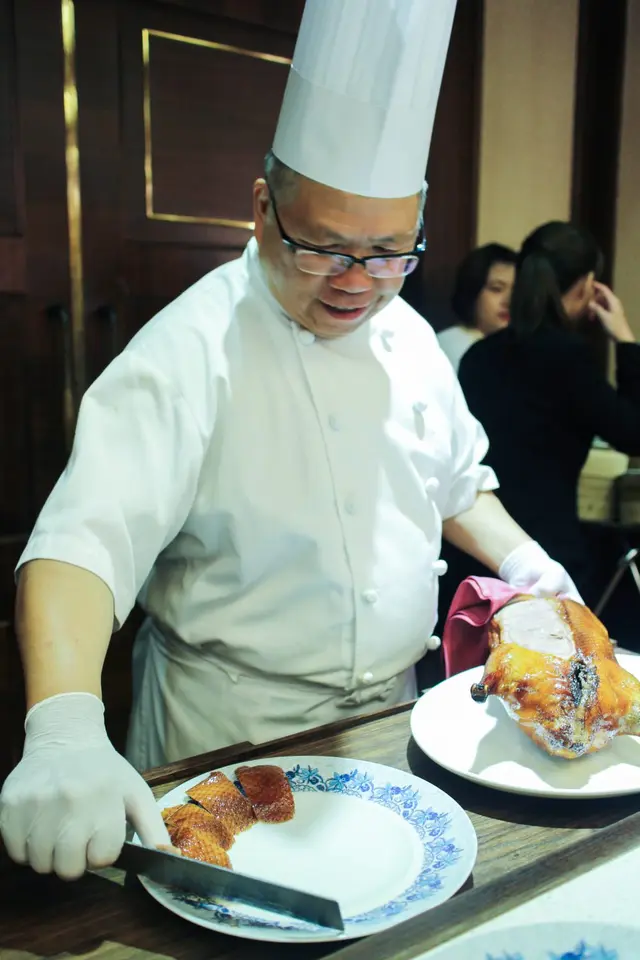 九華樓使用重約3.5公斤的宜蘭北京鴨種,一隻鴨大概可以片20片,片鴨當下吱吱作響,我的口水都快接不住