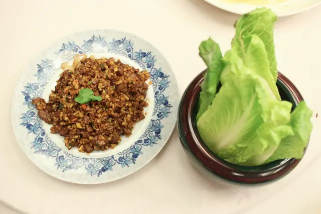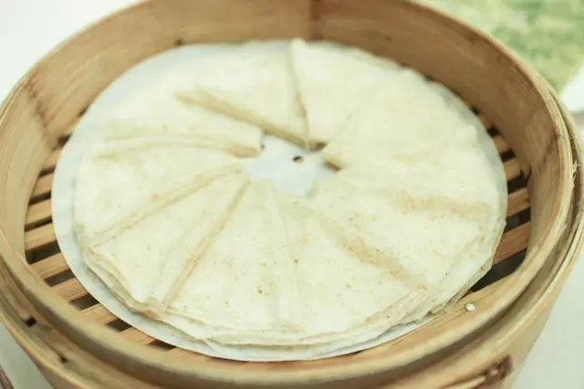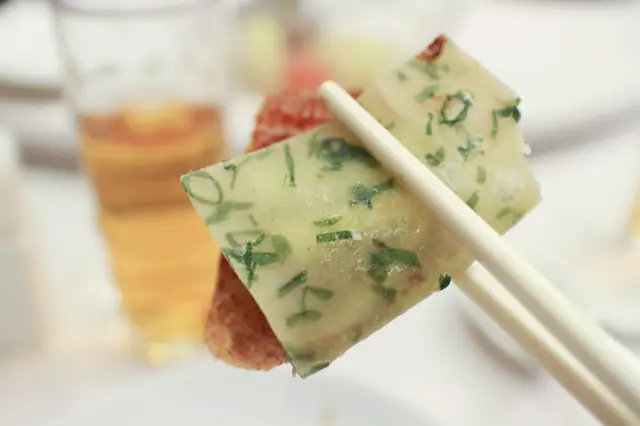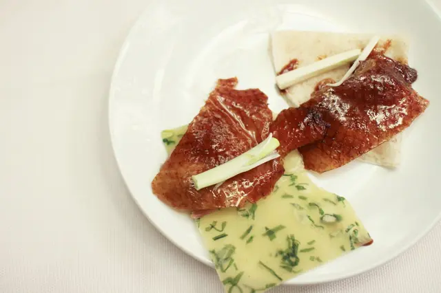 採用宜蘭三星蔥,滿滿的蔥香搭配片鴨皮,沾上少許醬料,一口吃到酥脆的鴨皮,還可吃出三星蔥的香氣,令人大呼過癮;蕎麥餅皮為傳統吃法,餅皮包覆片皮鴨肉、蔥、甜薑及小黃瓜加上甜而不膩的甜麵醬