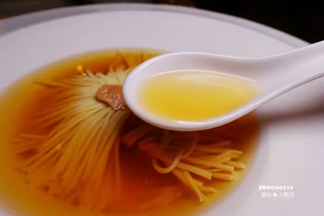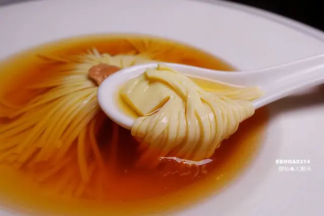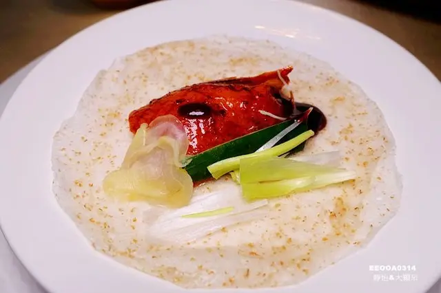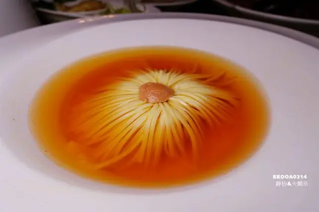 看看這刀工真的相當厲害啊,讓人不由得佩服主廚極致的刀工,方形豆腐以前14後14的刀工切花有如細絲般,上面放上的是鵝肝,不明說的話還看不出這是豆腐耶!