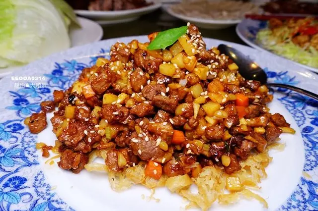 比較常見的是蝦鬆,大家有吃過鴨鬆嗎!?這鴨鬆的色澤炒的真美,鴨肉切丁後加入荸薺、紅蘿蔔等拌炒,最底下還有油條增加口感!