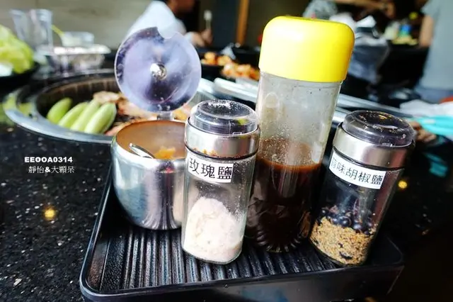 服務人員隨烤肉送上了醬料,有日式味噌、玫瑰鹽、蒜味胡椒鹽及日式醬油,可以自行酌量使用