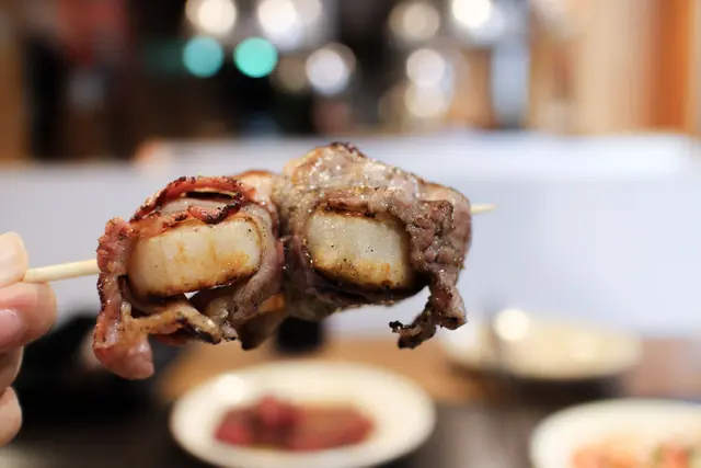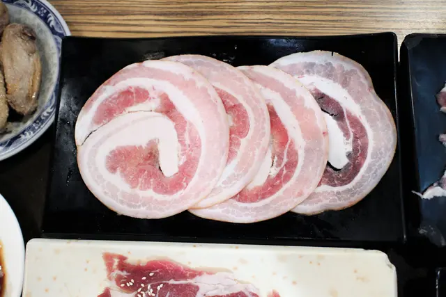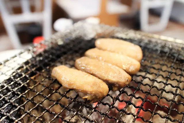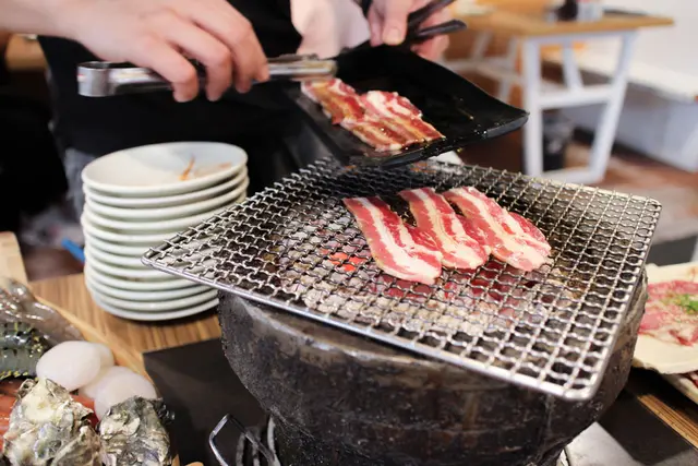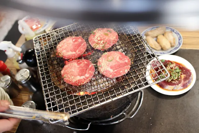 我們挑的是下午時間來,很幸運遇到服務生有空的時段,因此幾乎全程都有專人代烤,包含烤網該不該換了,服務生眼利手快立即為我們處理。胖肚肚燒肉不是那種和你硬聊的健談服務生,而是很專注的幫你烤肉,把注意力放在烤術把關,總是問我們:那秋刀魚用章魚燒口味好不好?剛好有培根,那就跟干貝捲一起吃,好嗎?