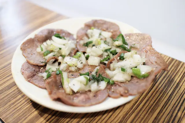 直到這道我發現了胖肚肚燒肉除了物美價廉外,在佐料真的超乎坊間燒肉店的用心,這蔥鹽層次很豐富,如你們看下圖所見蔥花、白芝麻,一直到包裹的蔥白和胡椒,還有香油,這真的是很豐富的佐料,把牛舌獨特的腥味一掃而光,牛舌吃起來脆口,和滿嘴的香氣