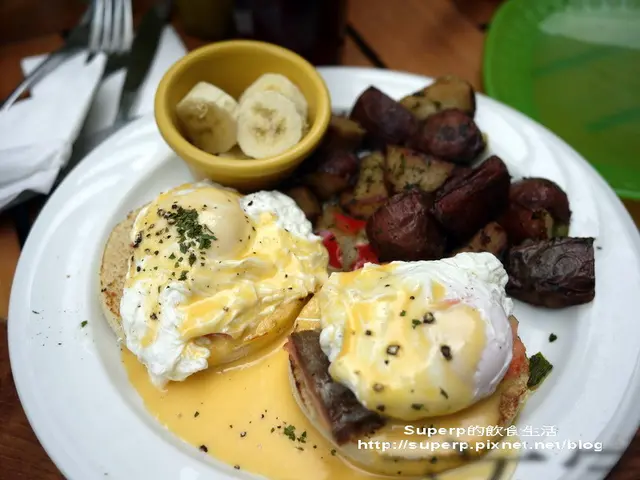 燻鮭魚班尼迪克蛋$280(除了燻鮭魚班尼迪克蛋以外,還有烤薯塊,以及香蕉。烤薯塊還加了香料去烤,我覺得比薯條好吃。班尼迪克蛋是半熟的,基本上應該怎麼做都好吃,無可挑剔。不過我覺得這次的燻鮭魚似乎品質沒那麼好,跟班尼迪克蛋一起吃並沒有加分的作用。我看以後我會選擇原味的,或菠菜還是酪梨蝦仁班尼迪克蛋)