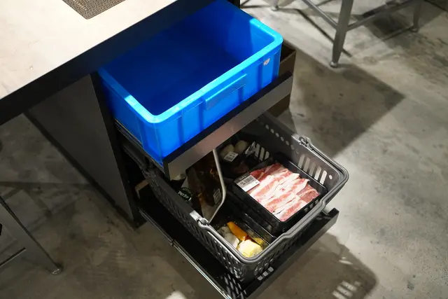 座位底下有兩個抽屜(上層為盤子收納籃、下層為剛剛結帳的食材)