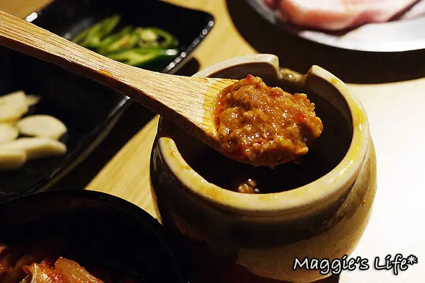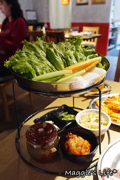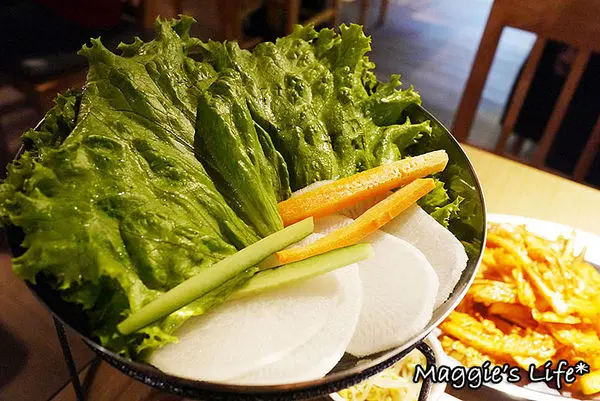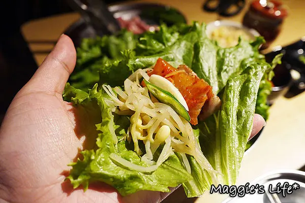 烤好搭配生菜和配菜包在一起吃,十足的韓國風味。
