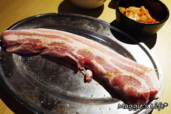 厚切豬五花,長條型狀看起來不會很大,但實際烤好剪成塊狀份量包生菜還剛剛好喲!