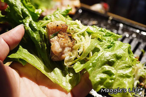 金槍魚其實就是鮪魚,烤好後味道全部融合在一起,帶有些微的辣味,要包生菜吃也可以。