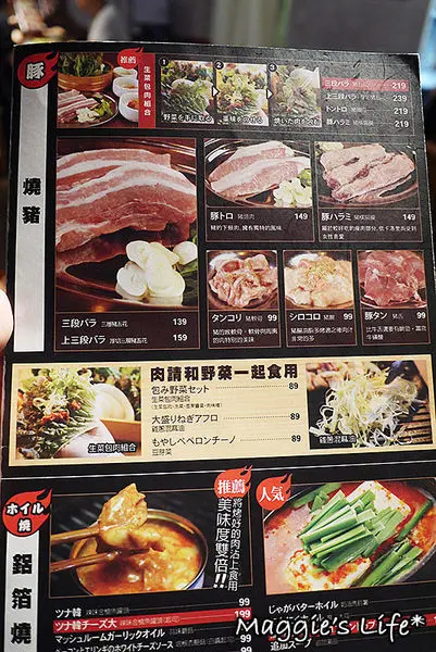 一般的日本料理或居酒屋店、燒烤店,都會有各式肉類料理,這裡倒是以雞、豬肉品為主,不賣牛肉,跟同集團的另一家大阪燒肉雙子以豐富的牛肉料理不同,倒也是區隔開客層。