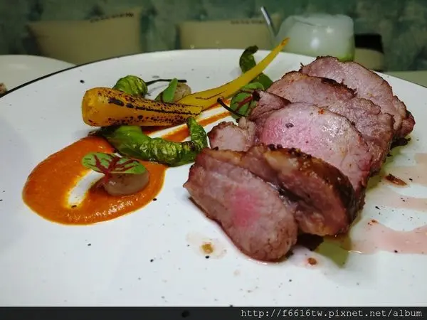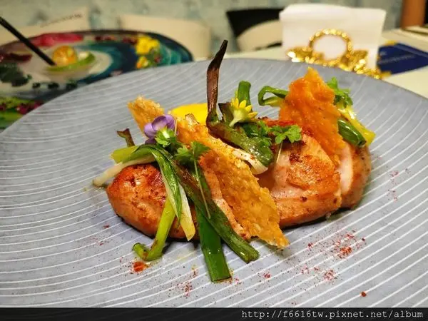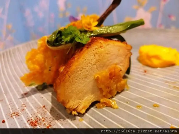 雞胸肉以最新流行的舒肥Sous Vide料理手法(低溫烹調)先用慢火爐烤方式鎖住肉汁,最後將表面微煎帶出香氣,株蔥香氣與紅蘿蔔奶油醬,完全襯托出雞肉的鮮甜味