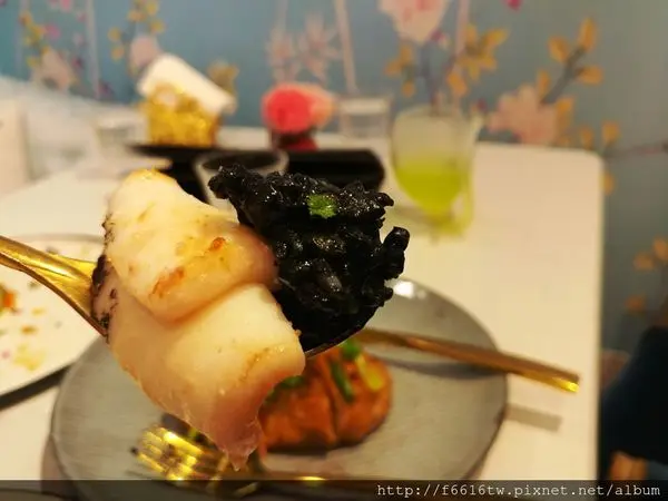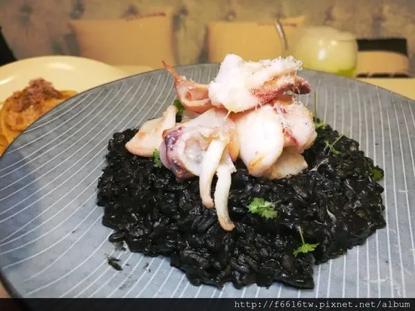 炙烤透抽墨魚飯 主廚使用義大利米中之王的加拿大黑野米讓燉飯口感Q彈,加上炙燒過新鮮直送透抽,滿滿海味