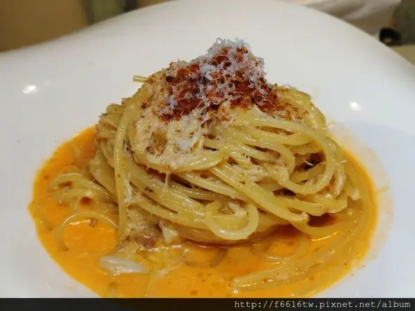 櫻花蝦蟹肉義大利麵 看似平凡無奇.翻開麵後底層看見滿滿蟹肉,加上烤過櫻花蝦的香氣,很特別