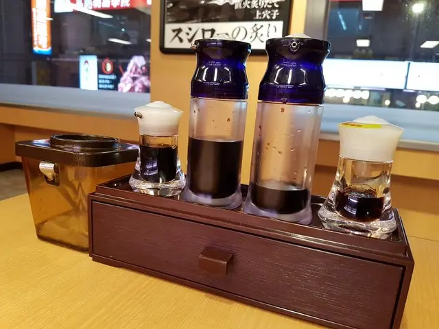 ▲桌子上面會有醬油柑橘醬跟甜醬