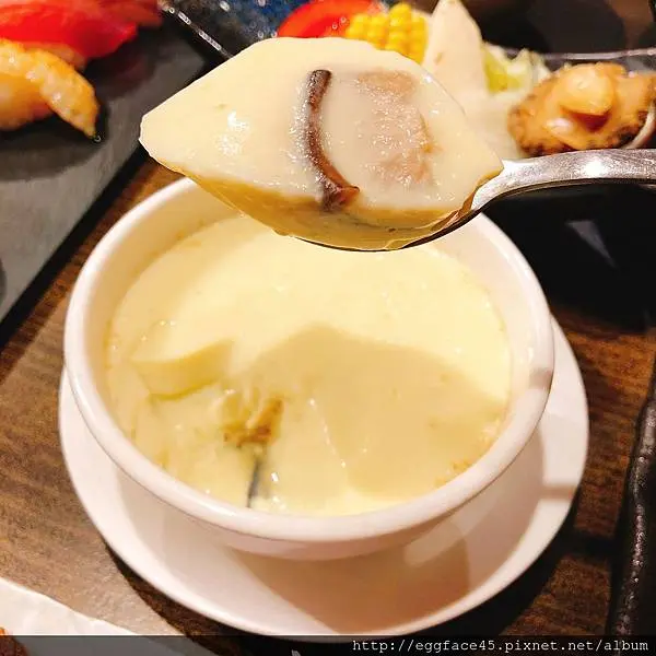 茶碗蒸,裡面滿滿的海、陸配料,有雞肉、香菇、蛤蜊、蟹肉…等。