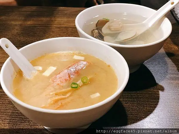 甜蝦頭味噌湯(御膳套餐):湯頭濃郁,一口喝下滿滿的鮮甜蝦味,蝦爆的味噌湯!! 文蛤清湯(單點70元):蛤蜊新鮮飽滿,喝起來有淡淡的清甜感。