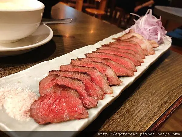 夾起一片沾點玫瑰鹽品嚐,肉汁在嘴中慢慢釋出