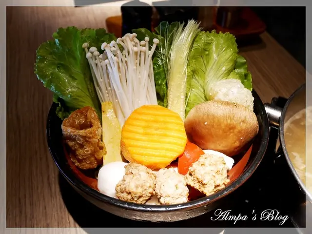 菜盤裡有各種新鮮豐盛的蔬菜、菇類、紅蘿蔔、蕃茄、魚丸、豆皮、炸豬皮、帶鬚玉米筍、木耳、手工川丸子、南瓜、芋頭。